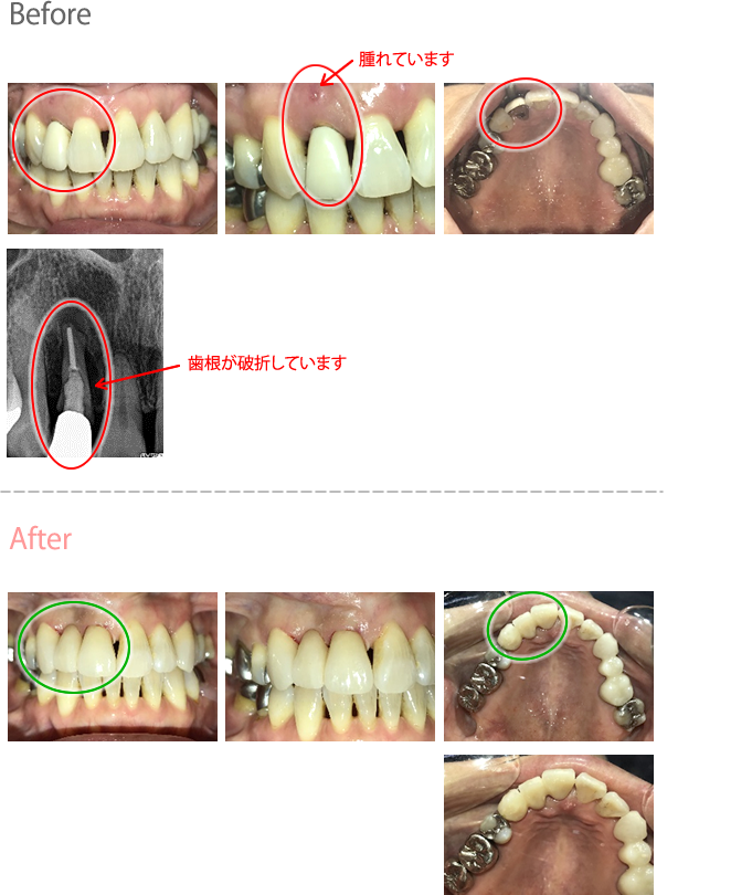 レントゲンを撮り詳しく診てみると、歯根が破折して保存することができず、抜歯する必要があることがわかりました。抜歯後、オールセラミックブリッジで補綴(欠損した部分を人工物で補う)しました。ブリッジの支台になっている後方の歯は、根尖性歯周炎(根の先端で問題を起こしている)でしたので、根管治療をしています。