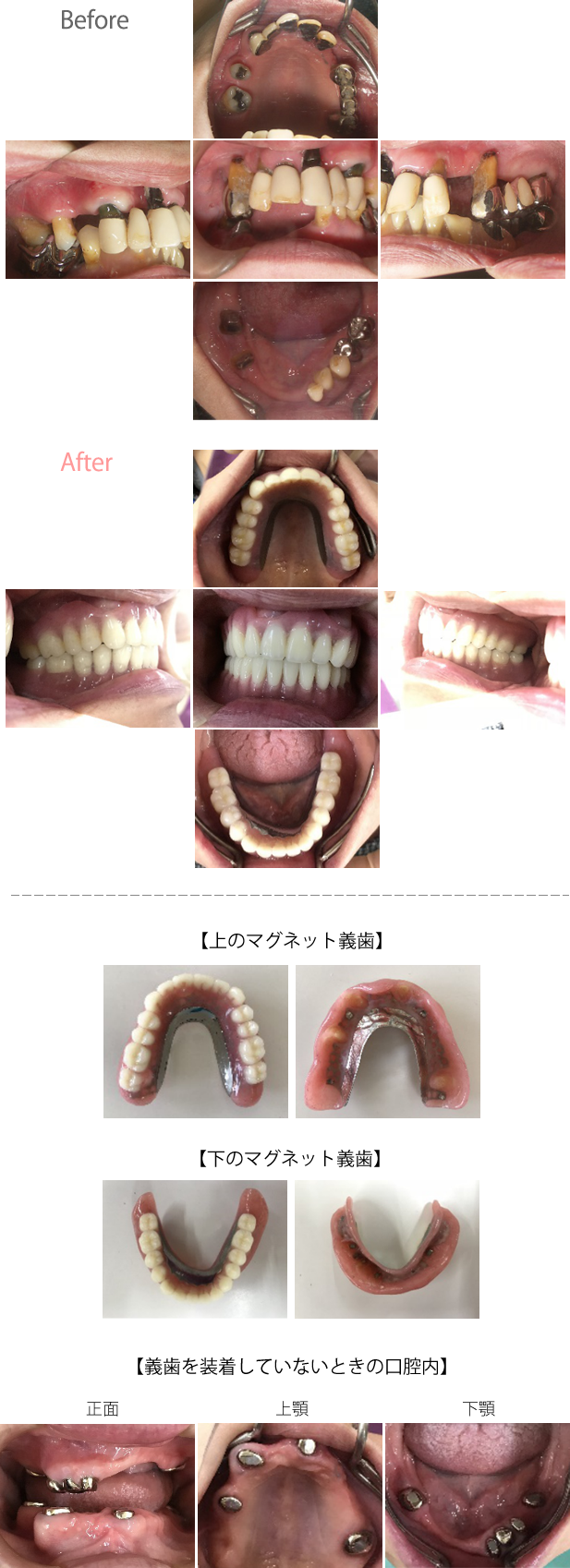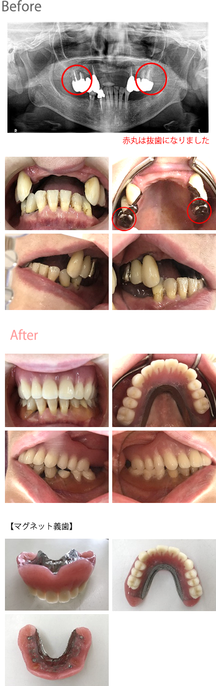 全体的に歯周病が進んでいましたので、歯周病の治療をしました。どうしても残せない歯が2本ありましたので抜歯し、残っている歯をすべて根管治療し、マグネット式入れ歯にしました。